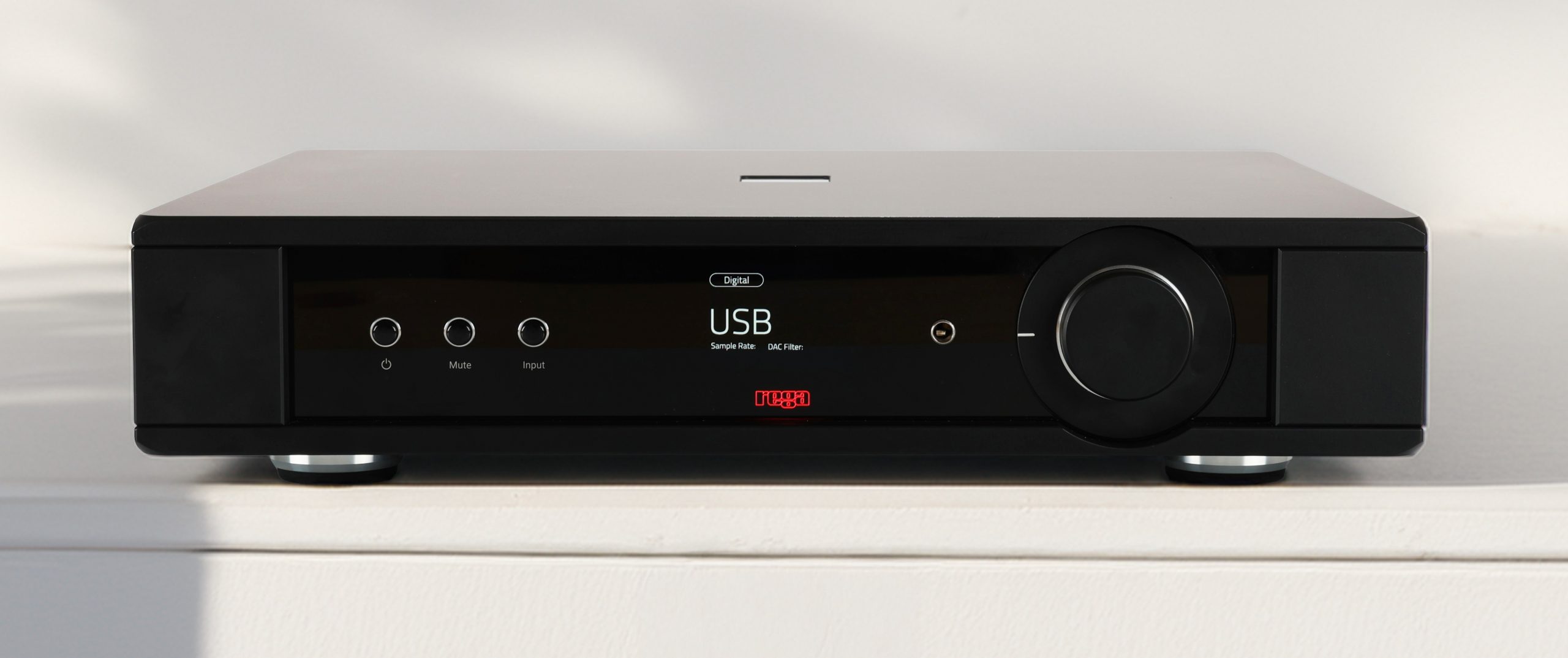 Avant de passer à mes impressions d’écoute, quelques éléments fonctionnels de base : le préamplificateur Mercury intègre un DAC haute performance dérivé de celui utilisé dans les lecteurs CD Saturn Mk3 et Isis, modèles phares de la marque, ainsi qu’un amplificateur pour casque à composants discrets, que Rega compare à un mini-Solis en raison de sa capacité à délivrer à la fois une tension et un courant élevés. Il est aussi doté d’un écran IPS couleur. La façade sombre, légèrement satinée, qu’il partage avec le Solis, affiche un style sobre mais élégant, avec seulement trois boutons à gauche — Marche, Muet et Entrée —, un écran au centre et une molette de volume à droite. Le préamplificateur est également livré avec une télécommande robuste et agréable en main, dont le rétroéclairage s’active grâce à un capteur de mouvement intégré.