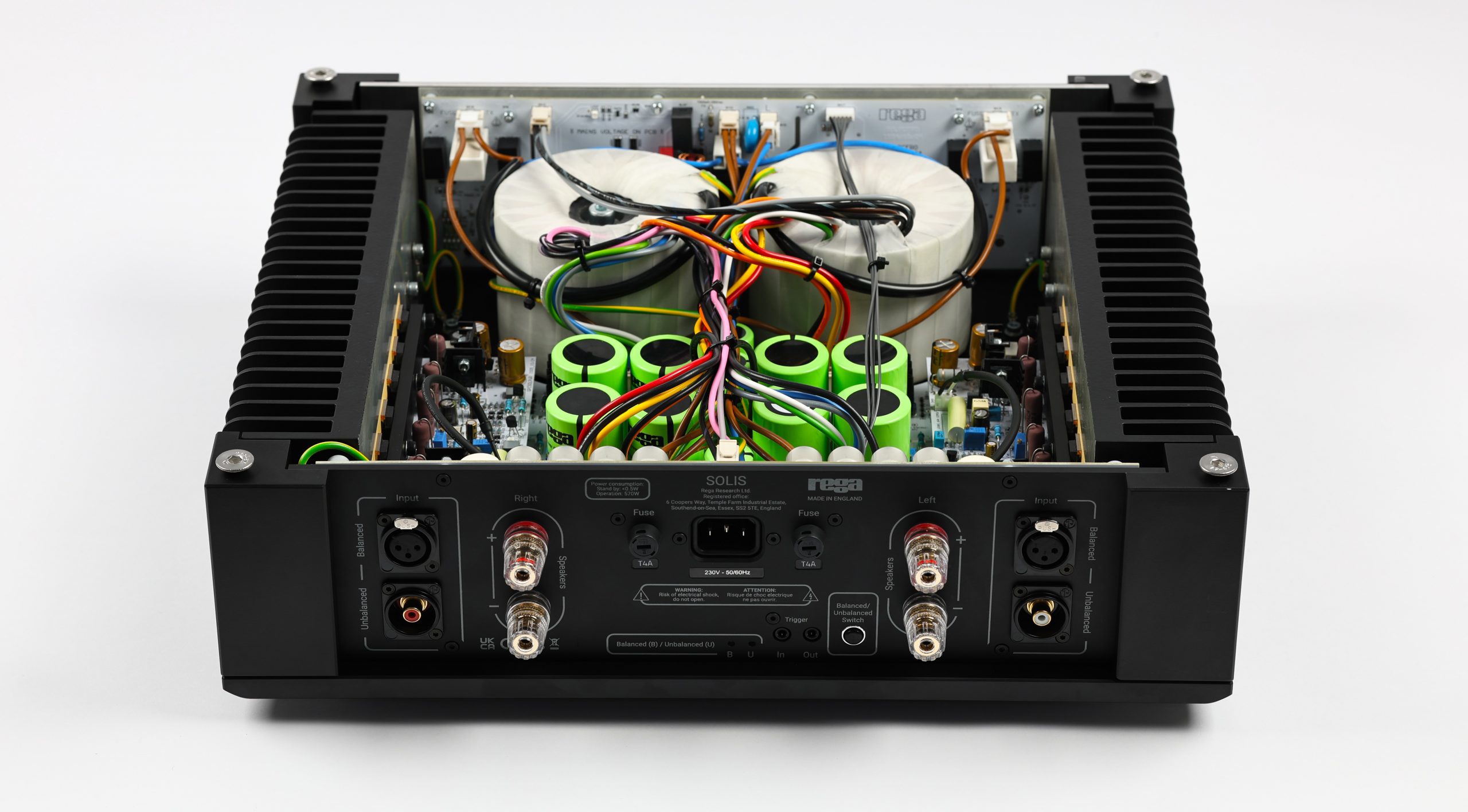 L’amplificateur Solis, annoncé à 168 W par canal sous 8 ohms et 305 W sous 4 ohms, propose des entrées symétriques et asymétriques, et reprend l’esthétique du Mercury, bien qu’il n’arbore que deux boutons en façade — Marche et Muet.