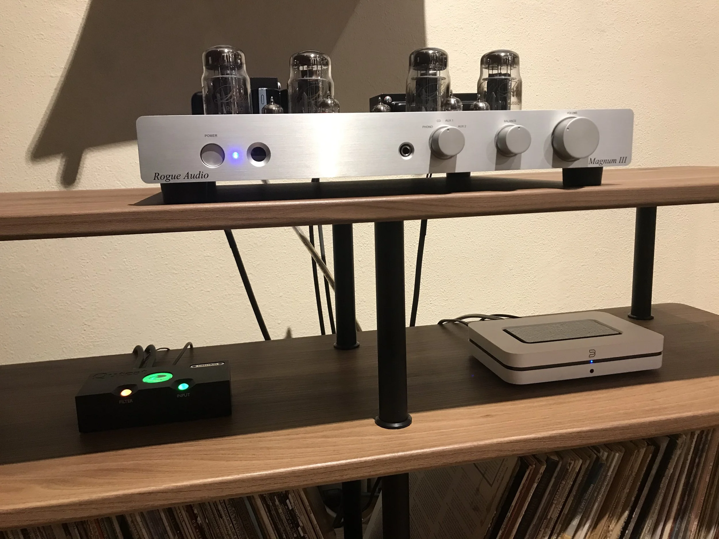 À ce stade, je savais que je pourrais recommander Ian à n'importe lequel de mes amis cherchant à acheter des produits audio - à condition, bien sûr, que le système que nous allions entendre soit bon. Le moment de vérité est donc arrivé lorsque Okkyum et moi nous sommes assis devant l'installation suggérée de 10 000 $, le populaire système musical que Ian a surnommé Krypton. Le système est normalement vendu avec une platine, mais pour les besoins de cette chronique, une source numérique a été utilisée à la place. Le système se compose d'une paire d'enceintes Audio Physic Classic 15 de 89 dB, d'un amplificateur intégré Rogue Audio Cronus Magnum III à tubes de 100 Wc, d'un streamer Bluesound NODE, d'un DAC Chord Qutest et d'un câblage Cardas Audio Iridium.