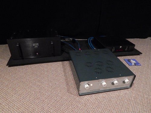 Le matériel de Karim n'est pas placé sur un rack à composants, mais sur le sol, sur une plaque métallique, suffisamment bas pour ne pas bloquer la vue de l'écran de cinéma qui descend du plafond entre ses enceintes. La Thöress, en revanche, est posée directement sur la moquette. Karim a remarqué un « durcissement » du son de la Thöress - une présentation moins « harmonieuse » - lorsque le préamplificateur est placé sur la plaque. Karim propose : « Peut-être s'agit-il d'un décalage entre le métal et les tubes à l'intérieur de la Thöress, mais je n'en suis pas sûr ».