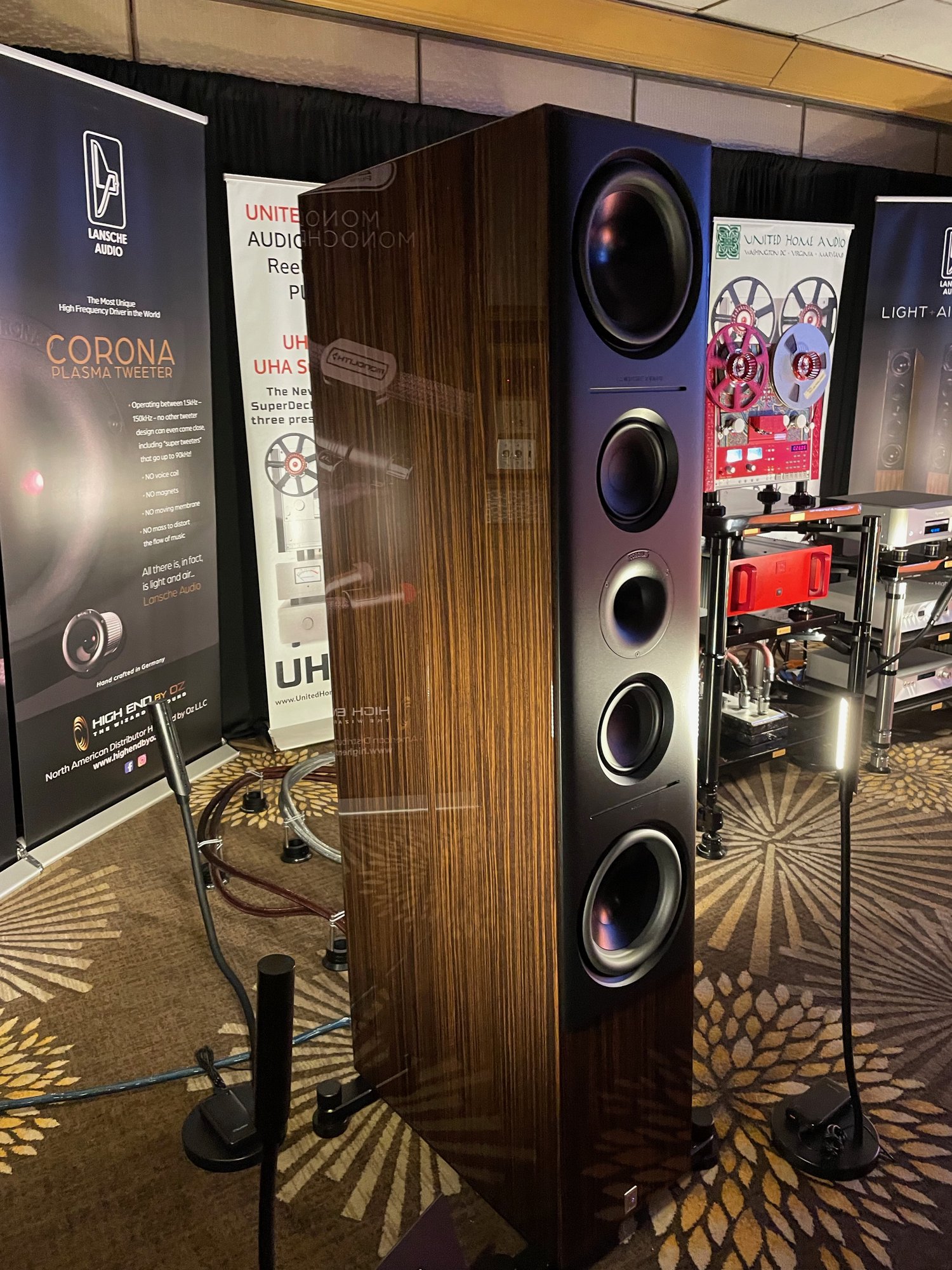 De toutes les salles que j'ai visitées, la salle High End by Oz présentait la paire d'enceintes la plus chère du salon, la Lansche 7.2 qui est dans les six chiffres. Ayant déjà entendu des systèmes de très haut de gamme à la sonorité horrible, je suis le premier à dire qu'un prix élevé n'est pas nécessairement synonyme de meilleures performances. Mais la qualité sonore que j'ai entendue dans cette pièce m'a rappelé que c'est parfois le cas. Ce système sonnait richement, sophistiqué et offrait une large scène sonore avec une authenticité timbrale qui donnait aux instruments un son très réaliste.
