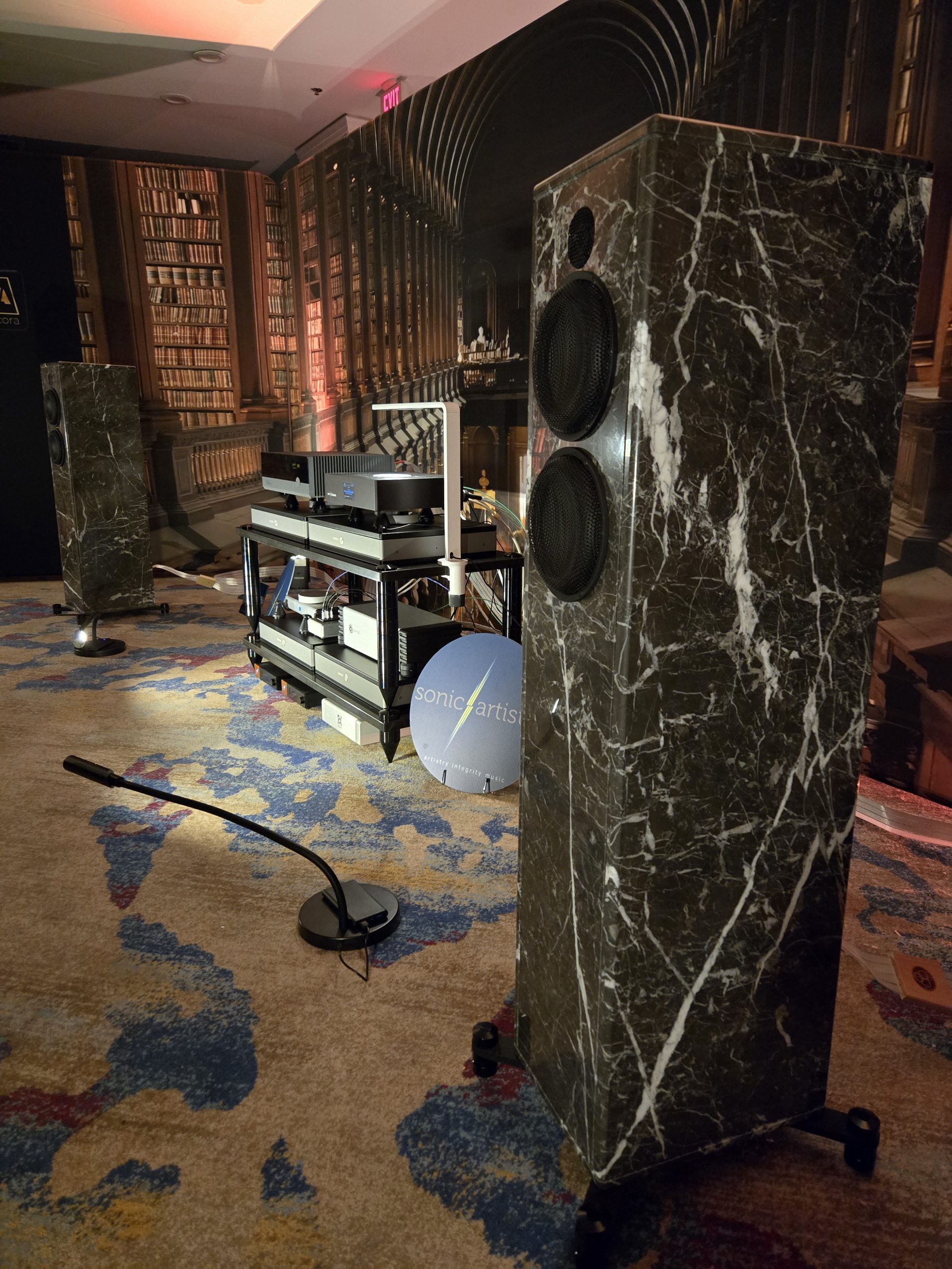 La salle de Sonic Artistry m’a complètement ébloui — autant par le son que par le somptueux décor visuel représentant la Long Room de la bibliothèque du Trinity College à Dublin. Aucune photo ne rend justice à ce fond de scène, mais une fois assis devant, c’était une expérience psychédélique en 3D — j’aurais juré que les rangées de livres s’étendaient sur une centaine de pieds. Ce qui soulève une question : la profondeur de scène que j’ai perçue pendant la démo était-elle réelle, ou simplement une illusion d’optique ?