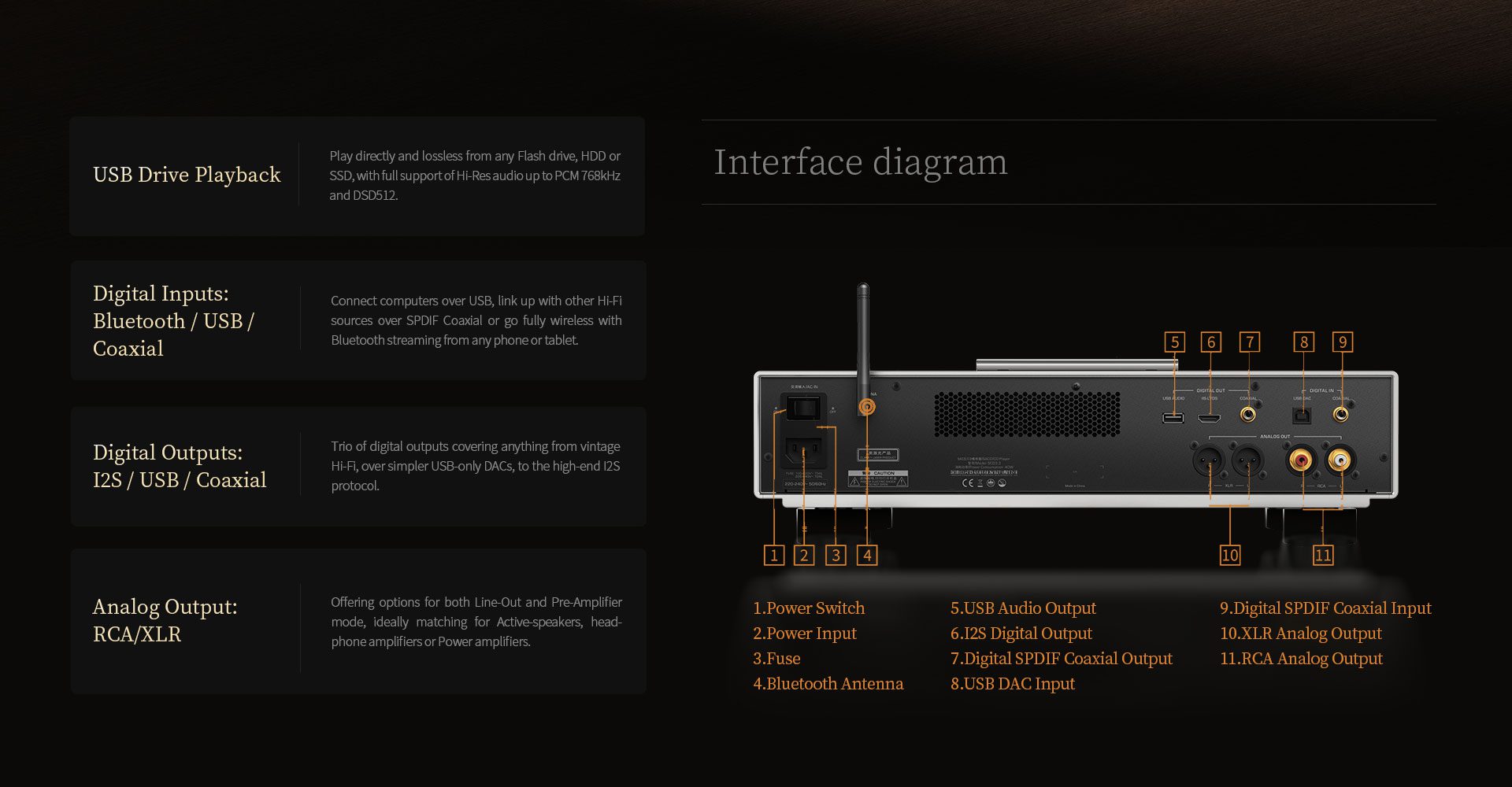 • Bluetooth 5.0 receiver, with support for LDAC, aptX HD, AAC, and other common codecs