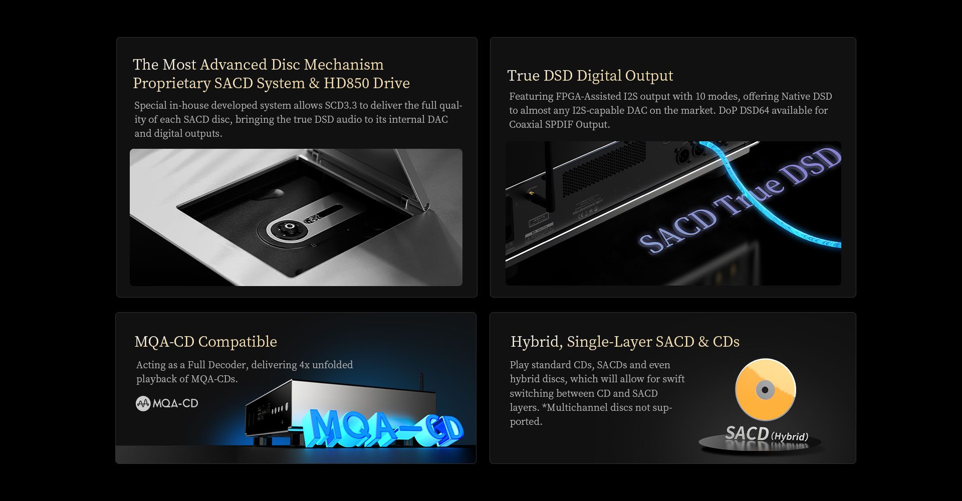 At the heart of the SCD3.3 is a proprietary top-loading disc transport. Dubbed the HD850, this mechanism eliminates the typical motorized tray in favor of a rigid, manual loading system. It supports SACD (stereo layer), standard CD, and MQA-CD formats, emphasizing mechanical stability and long-term reliability.