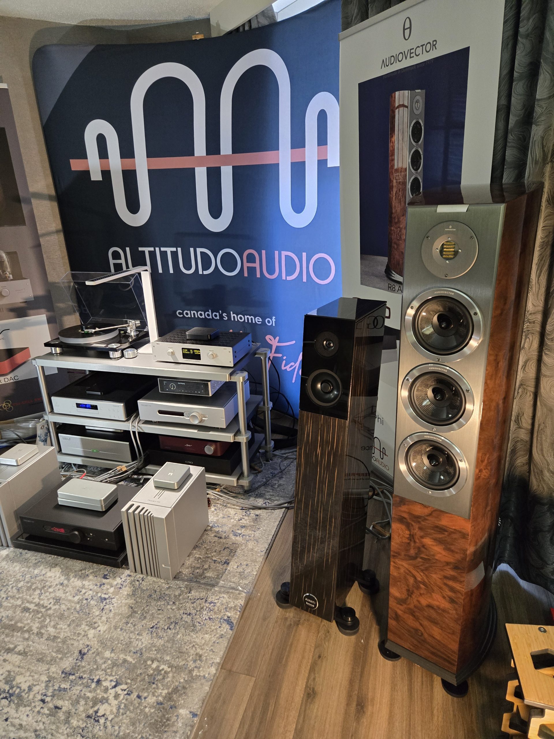 Altitudo showcased Audiovector’s R8 Arrete and Audio Physics Avanti speakers, driven by Trilogy electronics, with standout musicality and vivid imaging.