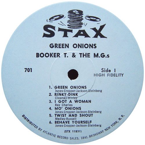 6- Booker T. & The M.G.’s – Green Onions. Stax – 701 (mono) (1962, Oct.), 33 1/3 rpm. Genre: rhythm and blues, Memphis soul, instrumental rock.
