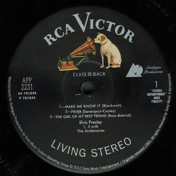 1- Elvis – Elvis Is Back!. RCA Victor – LSP-2231 (1960, Apr.), Analogue Productions – AAPP-2231 (2010), (2×45 rpm). Genre: rhythm and blues, blues, vocal, rock and roll.