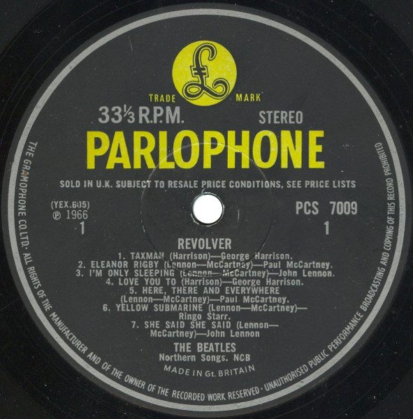 45- The Beatles โ Revolver. Parlophone โ PCS 7009 (UK) (1966, Aug.) 33 1/3 rpm. Genre: garage rock, baroque pop, chamber pop, art rock, folk rock, raga rock, Indian music, music hall, pop, R&B, soul, psychedelic, electronic, avant-pop, avant-garde, musique concrรจte.