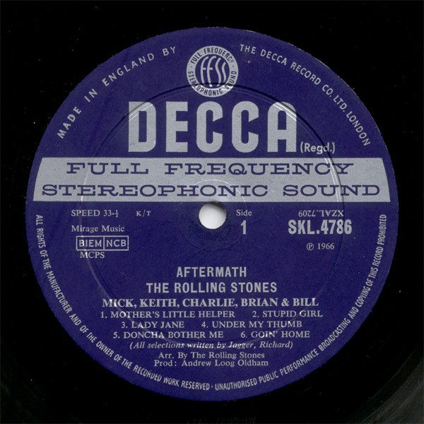 The Stonesโ fourth album, Aftermath, affirms the groupโs creative coming of age, featuring exclusively original compositions rather than the mix of covers and originals found on earlier releases. Influenced by the Beatlesโ Rubber Soul, the band experimented with nontraditional rock instruments while also moving away from its blues-based roots. Though recorded at RCA Studios in Hollywood, the album was first released in the UK on Decca in April, followed by the U.S. version on London Records in May. The latter is the preferable choice, as it opens with the raga-rock, sitar-inflected psychedelic โPaint It Black,โ which is absent from the UK edition. Both versions, however, include โLady Janeโ and the soulful โUnder My Thumb.โ